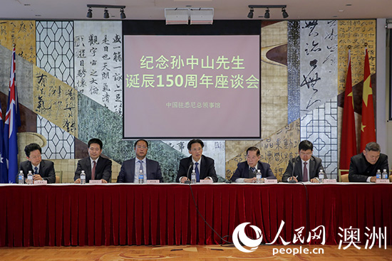 中國駐悉尼總領館舉行“紀念孫中山誕辰150周年座談會” 中國駐悉尼總領事顧小杰(左四)致辭(攝影 賀吉) 人民網悉尼10月25日電(盛楚宜)“紀念孫中山先生誕辰150周年座談會”暨“孫中山先生與華