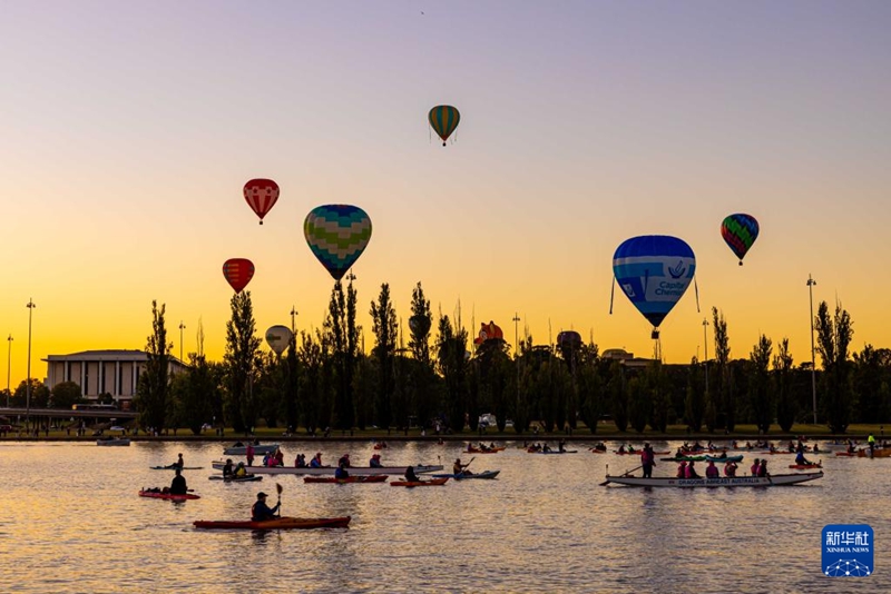 3月18日,熱氣球在澳大利亞堪培拉的伯利·格里芬湖上空飛行。 3月15日至23日,澳大利亞首都堪培拉舉行一年一度的熱氣球節。 新華社發(儲晨攝)