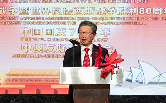 人民網悉尼9月30日電 為紀念中國人民抗日戰爭暨世界反法西斯戰爭勝利80周年、慶祝中華人民共和國成立76周年并喜迎中秋佳節,澳大利亞華人團體協會于27日晚在悉尼舉行慶?;顒?,中澳政商界代表、澳大利亞華