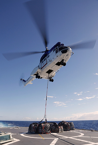 4月12日,美國海軍“塞薩爾·查韋斯”號補給船的直升機在給參與馬航失聯客機搜尋任務的澳大利亞海軍“珀斯”號軍艦進行補給作業。新華社發(澳大利亞國防部圖片)
