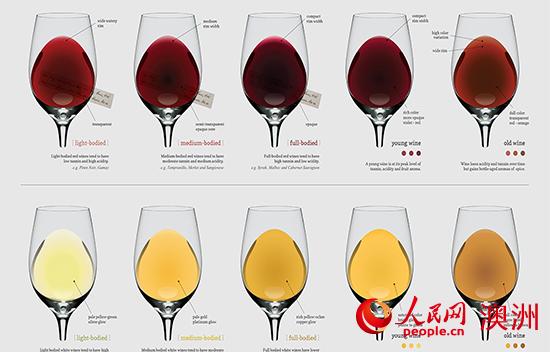紅、白葡萄酒的酒體參考和酒齡色澤表