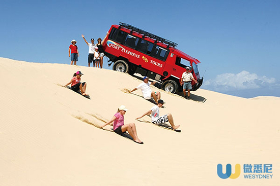 在史蒂芬斯港,“滑沙+出?!笔亲择{客必玩的人氣項目,通常這兩項活動是以套餐的形式打包提供給游客的。清晨時分,你可以驅車前往安娜灣(Anna Bay)的Lower Car Park公園,然后轉乘當地特有的四驅車“闖入”安娜灣茫茫的沙灘,從高達20多米的沙丘頂部滑下。