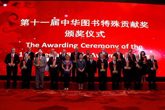 2017年8月22日,在人民大會堂舉行的第十一屆中華圖書特殊貢獻獎頒獎儀式上,魏華德(左一)被授予中華圖書特殊貢獻獎(圖片由受訪者提供)