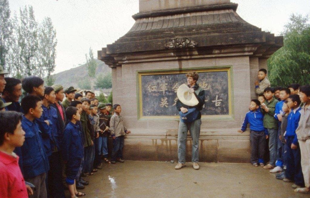 1985年,魏華德在陜西省吳起中央紅軍長征勝利紀念碑前被圍觀(圖片由受訪者提供)