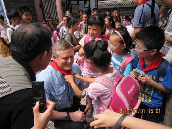 2011年,貴州省遵義市,魏華德再次來到他25年前曾到過的小學,小學生們為他戴上紅領巾(圖片由受訪者提供)