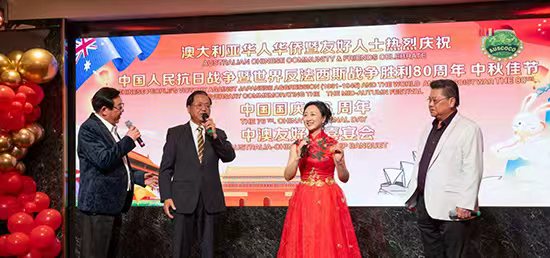 人民網悉尼9月30日電 為紀念中國人民抗日戰爭暨世界反法西斯戰爭勝利80周年、慶祝中華人民共和國成立76周年并喜迎中秋佳節,澳大利亞華人團體協會于27日晚在悉尼舉行慶?;顒?,中澳政商界代表、澳大利亞華人社團代表400余人出席。